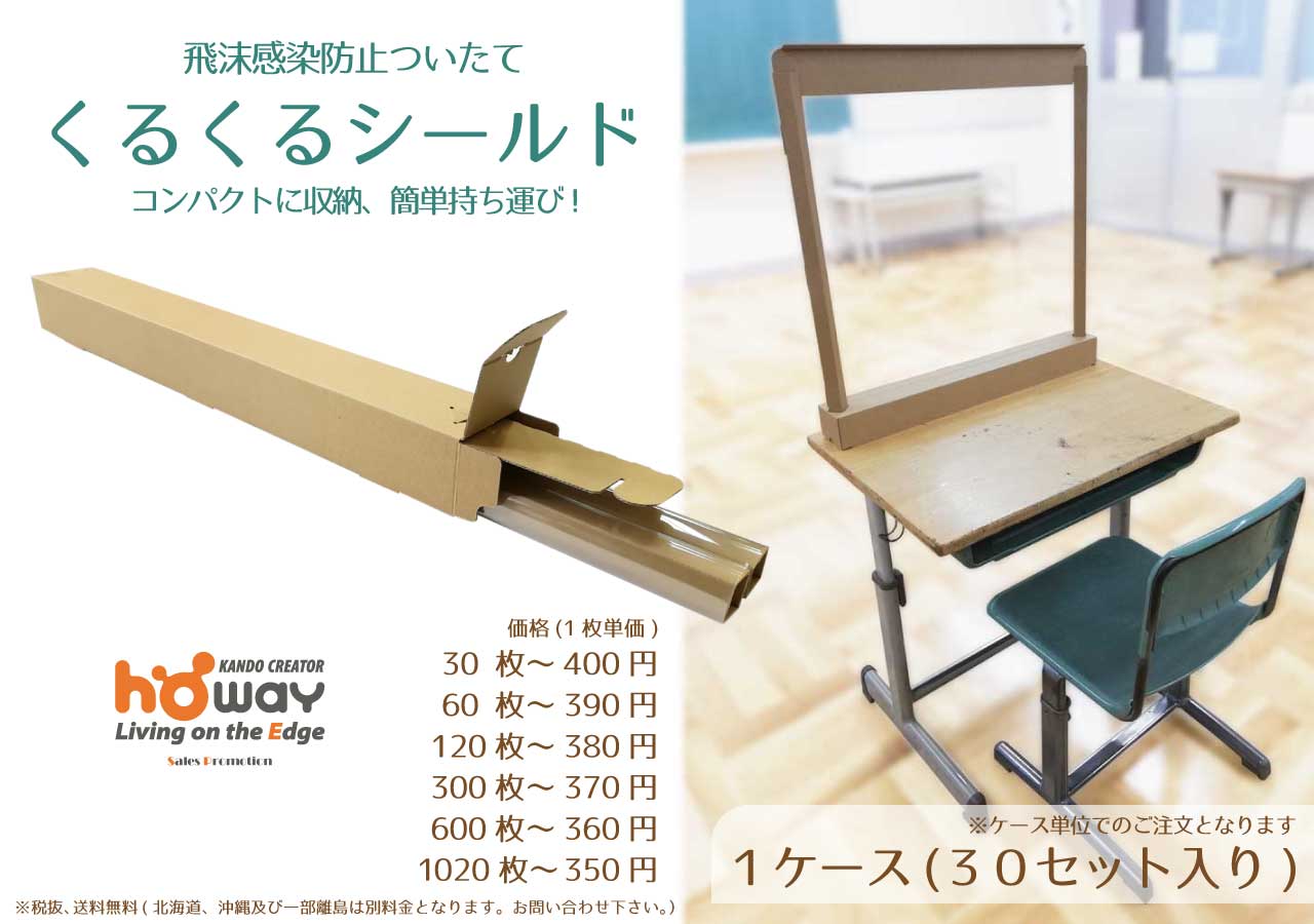 新型コロナウイルス感染防止対策に伴い、教育現場での子供たちの安全を守るパーティションなどが必須となっており、HOWAYでは学習机に設置するダンボール製の飛沫感染防止ついたて「スクールシールド8」シリーズ、また持ち運びに適した 【くるくるシールド】、オフィス用デスクにも使用できるパーティションなど製造しております。